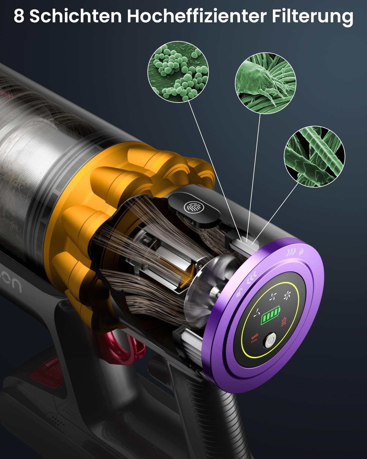 - 【99,99 % Hocheffiziente Filterung】 Das 8-schichtige hochdichte Schutzsystem des Akku Sauger kann bis zu 99,99 % Feinstaub und Bakterien filtern, den Staub weitestgehend im Staubbecher zurückhalten und die freigesetzte Luft reinigen. Wir haben auch das Fassungsvermögen des Staubbehälters (1,6L) erhöht, wodurch die Häufigkeit des Entleerens effektiv reduziert werden kann. Die Einhandbedienung ist bequemer und macht Spaß.
