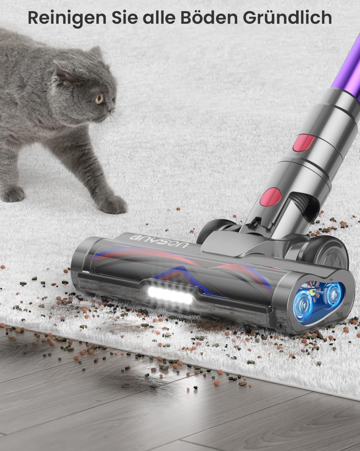- 【V-förmige Anti-Tangle-Bürste】Der Akku Staubsauger Tierhaare ist mit einer neuen V-förmigen Rollenbürste und einem 270° flexiblen Bürstenkopf ausgestattet, der die Wahrscheinlichkeit von Haarverfilzungen minimieren und problemlos Tischbeine, Wände und den Boden erreichen kann des Bettes und anderer Orte. Helle LED-Leuchten können Staub beleuchten, sodass Sie keinen Müll übersehen. Erleichtert die gründliche Reinigung von Bodenspalten sowie in Teppichen eingebetteten Tierhaaren und Schmutzpartikeln.