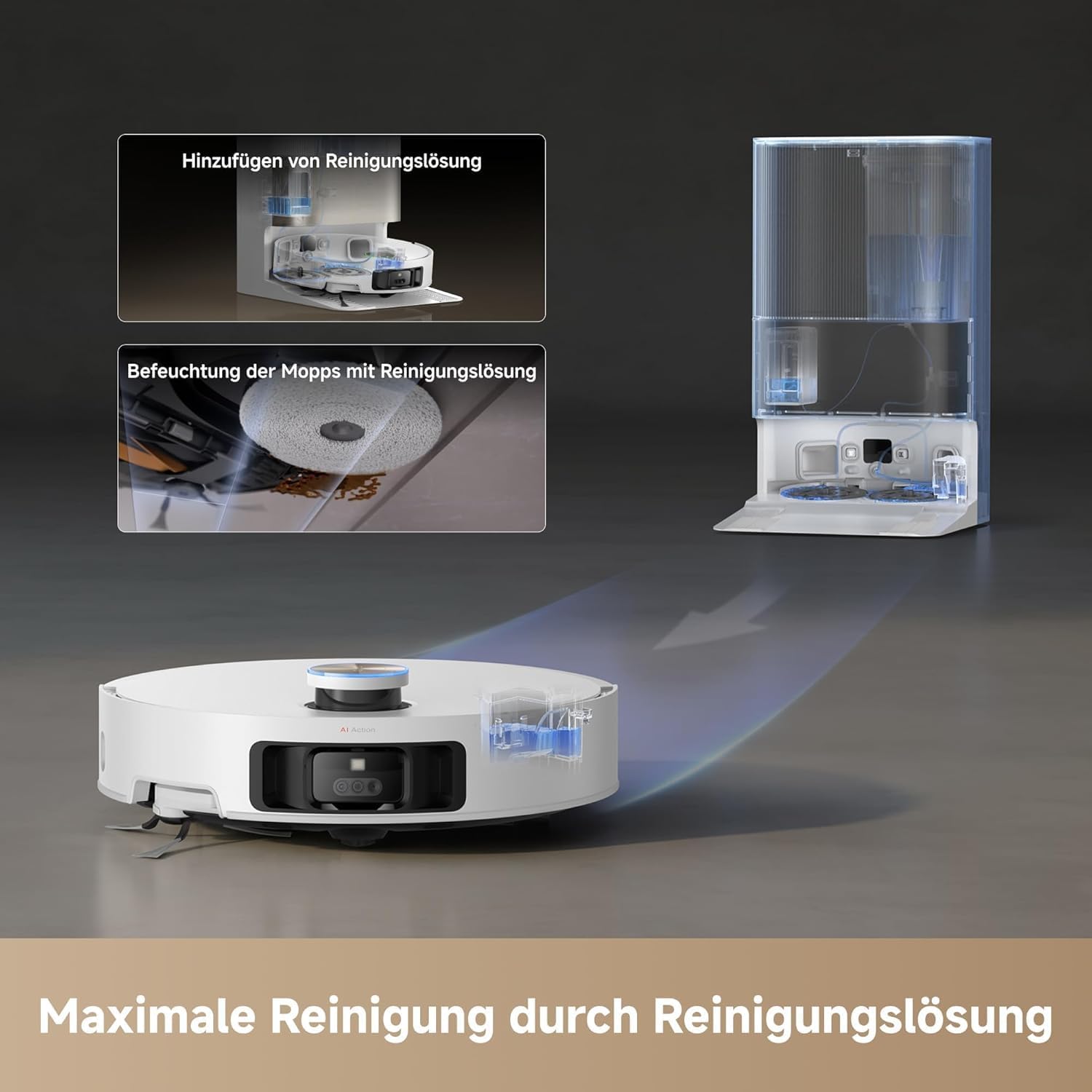 - Automatische Zugabe von Reinigungsflüssigkeit: Die Basisstation mischt selbstständig die verschiedenen Anteile der Reinigungslösung mit Wasser und sorgt so dafür, dass die Mopps ohne manuellen Aufwand frisch und sauber bleiben. Gleichzeitig wird die Lösung automatisch in den Wassertank des Roboters* gefüllt, sodass der Boden ohne manuelle Anstrengung gereinigt wird. *Um mögliche Schäden zu vermeiden, verwenden Sie unsere offiziellen Reinigungslösungen.