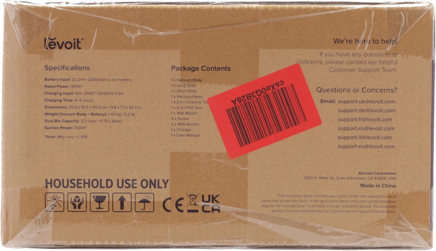 | Weitere Spezifikationen | ➤3 Jahre Motor-Garantie➤Anti-Haar-Verwicklung Technologie➤Laufzeit 12~50Min.➤Reinigungsleistung für Hartböden 99,7%➤LED-Bodenbürste➤99,9% Filterleistung➤Leichtgewichter Staubsauger mit nur 2,8Kg➤Hygienische Entleerung und Wartung➤Lebenslanger Kundendienst: support.de@levoit.com |