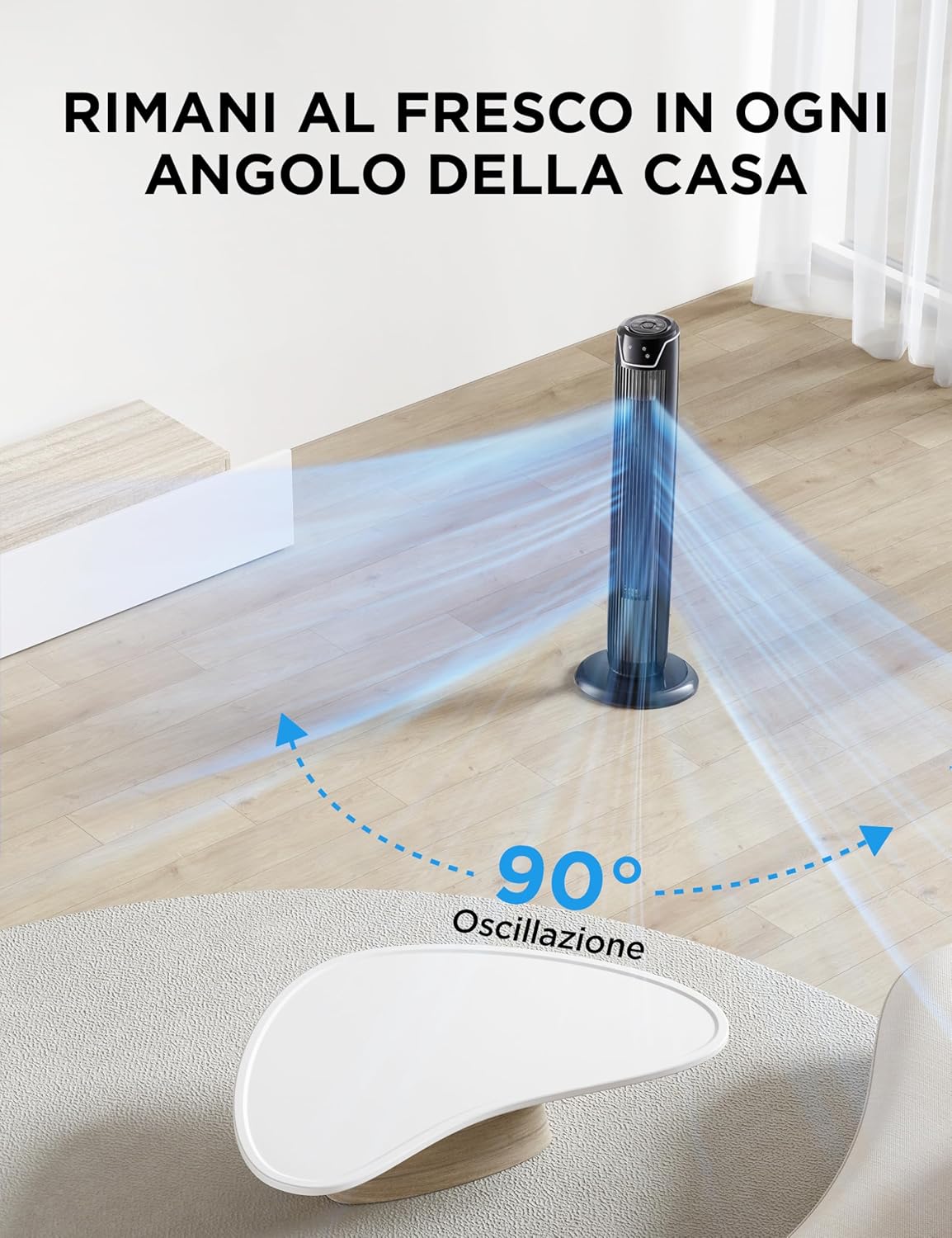 - 【90° Oszillation】Die 90 ° Oszillation sorgt für eine großflächige Kühlung im Raum. Damit ist eine bequeme Nutzung in der ganzen Wohnung möglich.