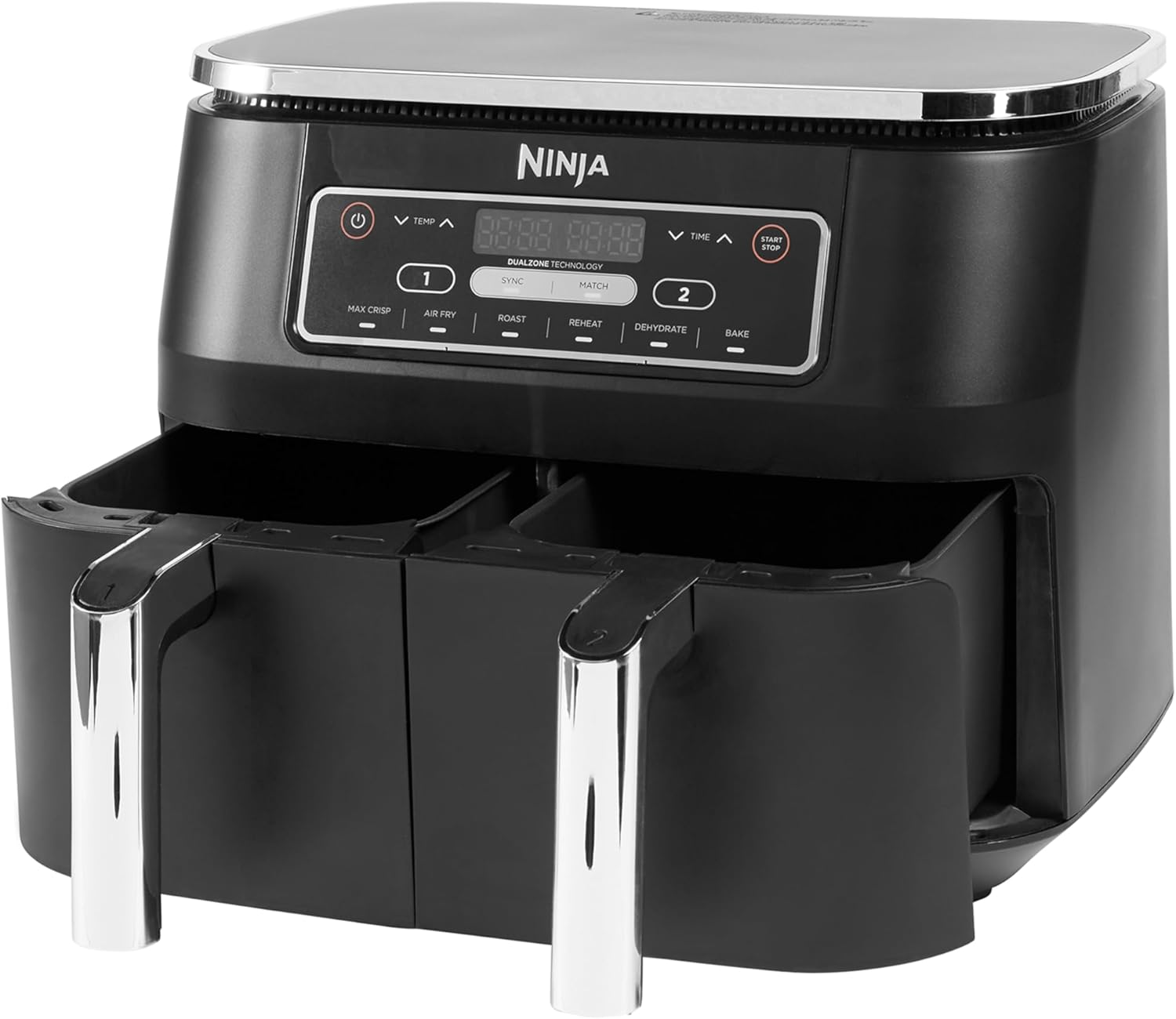 2 unabhängige Kochzonen, 6 Kochfunktionen, Air Fry (Heißluft-Frittieren), Max Crisp, Roast (Braten), Bake/Roast (Backen/Rösten), Reheat (Aufwärmen) & Dehydrate (Dörren), Antihaftbeschichtete spülmaschinenfeste Teile