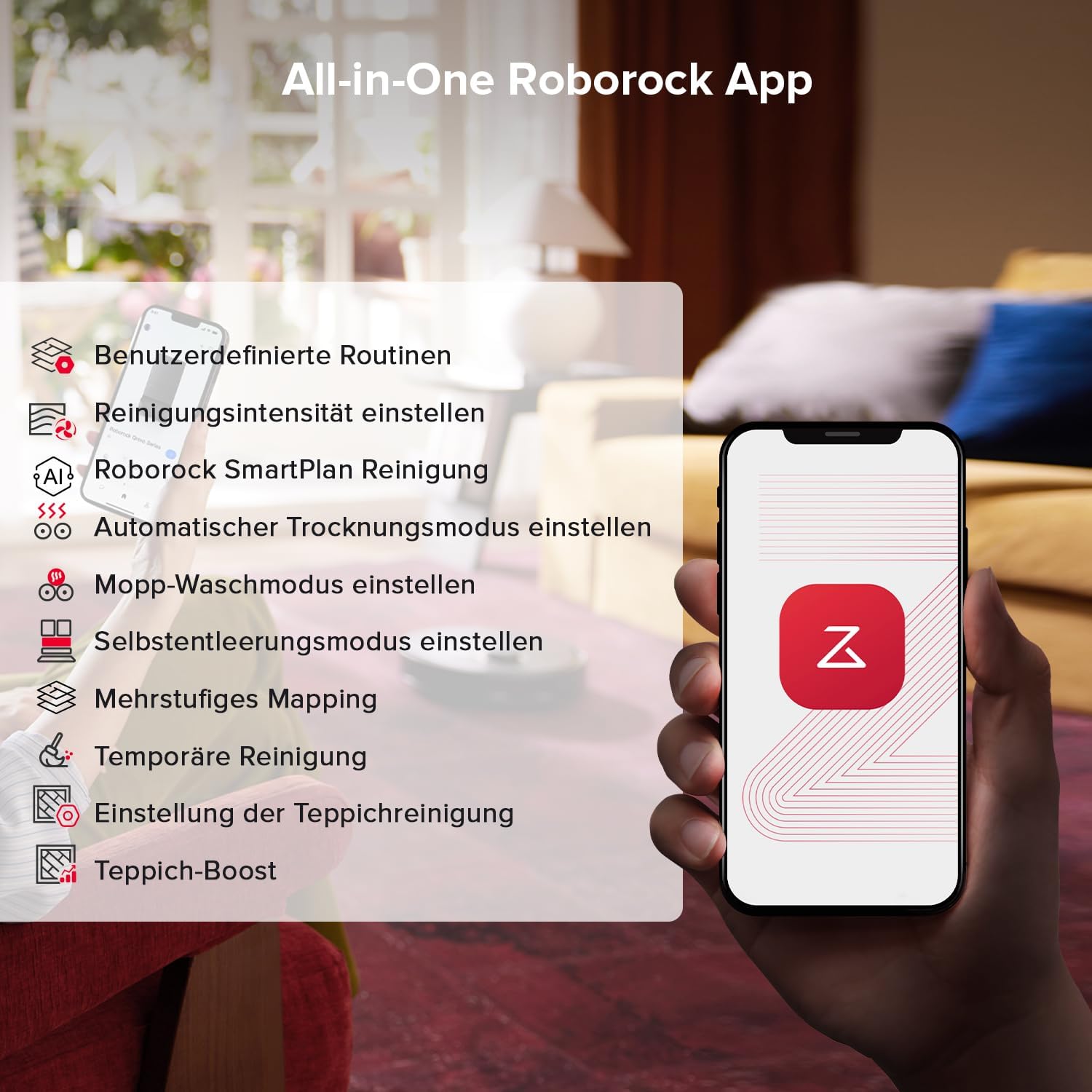 - Intelligente App-Steuerung und anpassbare Reinigung: Mit der Roborock-App haben Sie die volle Kontrolle: Planen Sie die Reinigung, richten Sie bestimmte Räume ein, legen Sie „Nicht-Reinigungszonen“ fest, oder verwenden Sie SmartPlan, um die Saug- und Wischleistung automatisch an die Bedürfnisse der einzelnen Räume anzupassen. Noch nie war die Reinigung so individuell und bequem.
