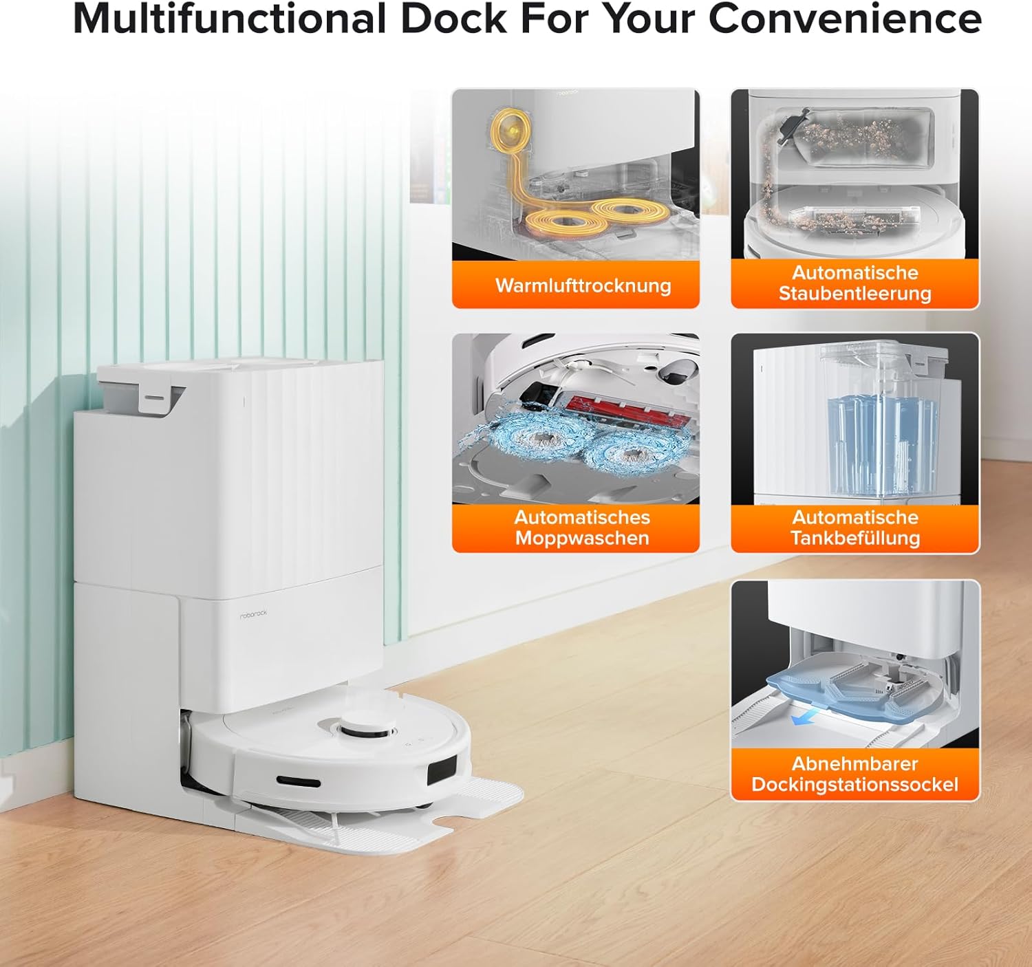 - All-in-One-Andocksystem und die fortschrittlichste Reinigungstechnologien. Vergiss Putzen - wirklich! roborock Qrevo Saugroboter mit Wischfunktion und Absaugstation unterstützt automatische Wasser-Befüllung/Entleerung, automatische Staubbeutel-Entleerung, automatische Reinigung der Mops plus Trocknung per Heißluft. Mit dem roborock All-in-One-Andocksystem und der roborock Qrevo Staubsaugerroboter mit Wischfunktion lassen Sie Ihre Hände frei haben und Ihre Zeit klüger genießen können.