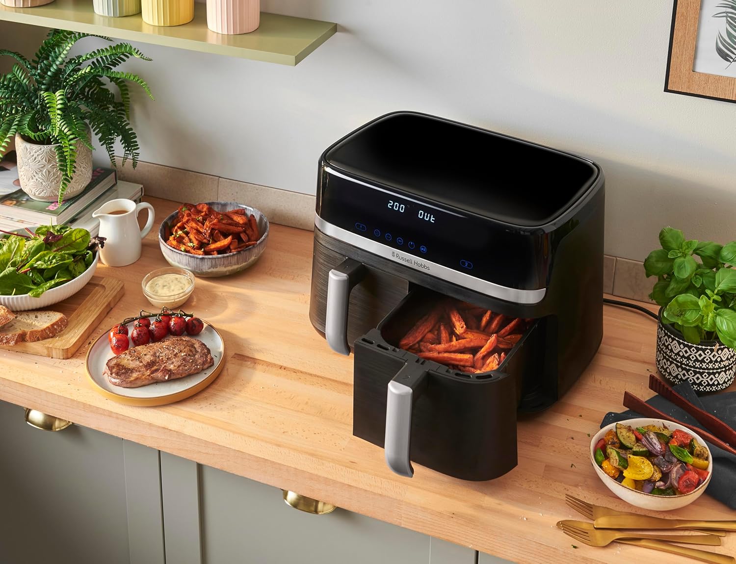 Russell Hobbs Heißluftfritteuse 2 Kammern 9L Rapid AirFryer [2 Fächer je 4,5l, sehr leiser Betrieb, 9 Programme] SatisFry Fritteuse (spülmaschinenfest, Match & Synchronisierungsfunktion) 27681-56